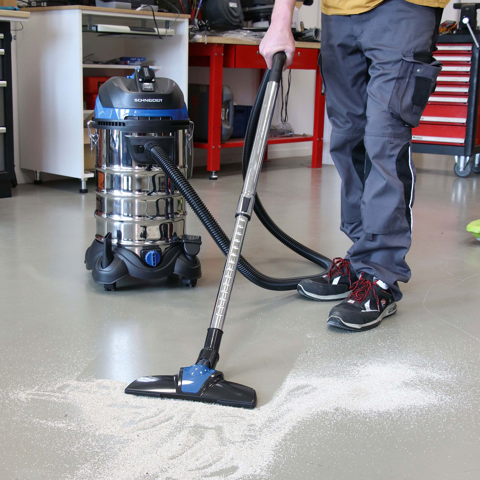 Kraftfull våt- och torrdammsugare från Schneider med 30 liters rostfri behållare. Utrustad med eluttag för elverktyg och automatisk start/stopp. Smidig och robust modell för verkstad och industri.